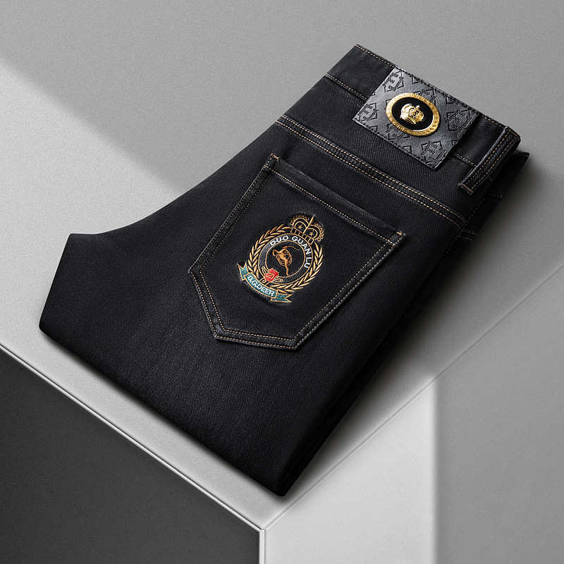 Winter Plus Velvet Thickened Men's Trousers Light Luxury Business Denim Fashion Embroidery Elastic Slim Straight Pants